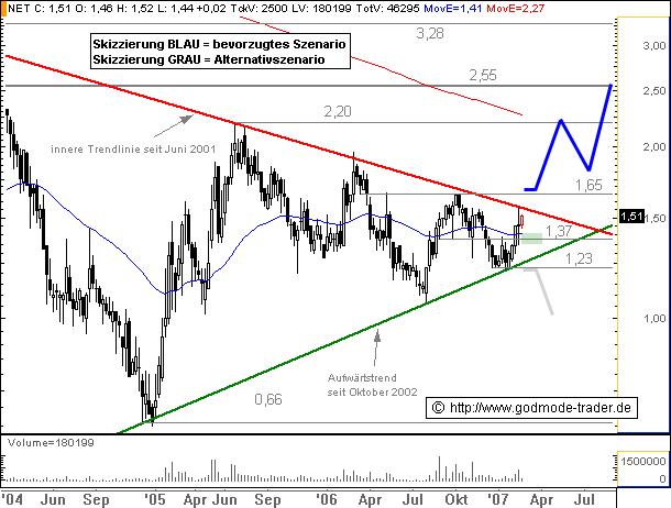 Rückblick: Die Aktie der NET AG Aktie rutschte nach dem Allzeithoch im Mai 2000 bei 39,00 Euro deutlich ab und markierte im Oktober 2002 nach über 99% Kursverlust bei 0,35 Euro das Allzeittief. Seit dem bewegt sich die Aktie volatil seitwärts, wobei sich die Handelsspanne verengt und eine riesige dreiecksförmige Kontur erhält. Die Unterkante bildet der Aufwärtstrend seit Oktober 2002, an dem die Aktie zuletzt im Januar 2007 nach oben hin abprallte. Aktuell nähert sie sich der inneren Trendlinie seit Juni 2001 bei 1,72 Euro, welche die Oberkante des Dreiecks darstellt. Das mittel- bis langfristige Chartbild ist momentan absolut neutral zu betrachten.