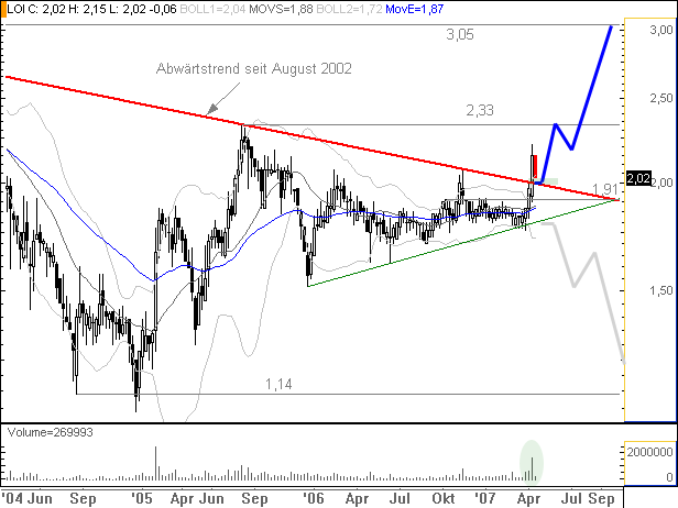 Rückblick: Die D. LOGISTICS Aktie (Nachrichten/Aktienkurs) musste nach ihrem Allzeithoch bei 110,50 Euro aus dem August 2000 eine massiver Abverkaufsbewegung hinnehmen. Diese endete erst im März 2003 mit einem Tief bei 0,91 Euro. Seitdem bewegt sich die Aktie in einem symmetrischen Dreieck seitwärts. Vergangene Woche brach sie unter stark erhöhten Umsätzen aus dem Dreieck nach oben hin aus und generierte ein mittelfristiges Kaufsignal. In dieser Woche vollzieht sie den Rücksetzer an das Ausbruchslevel bei 1,99 - 2,02 Euro. Das kurzfristige Chartbild ist jetzt bullisch zu werten, das mittelfristige ist neutral mit bullischer Tendenz.