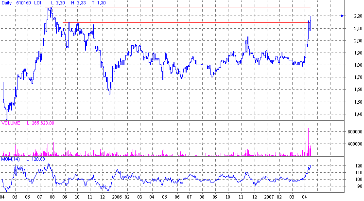 Anleger sollten jetzt auf einen charttechnischen Rücksetzer in Richtung des Ausbruchs bei 2,00 Euro warten. Unter 2,05 Euro könne man langsam mit vorsichtigen Käufen beginnen. Wer noch keine Aktien von D.Logistics hat, baut dann eine erste Position auf, so die Experten von "Pennystockraketen.de". Alternativ sollten Anleger jetzt die Hälfte der Position kaufen und bei Schwäche noch einmal nach legen. Der Titel eigne sich unverändert ausschließlich für hartgesottene Turnaround-Spekulanten. (Ausgabe vom 13.04.2007)