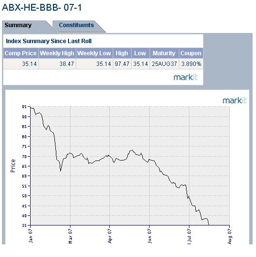 Wirf mal einen Blick auf den ABX-Junkbond-Chart unten. Der hat sich seit Jan. fast gedrittelt. Da ist mMn noch gar nichts ausgestanden. Das dicke Ende bei den Finanz-"Werten" kommt erst noch.