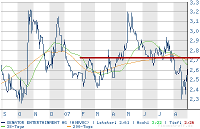 Zum jetzigen Zeitpunkt bestätigen die Analysten von First Berlin ihre "buy"-Empfehlung und ihr Kursziel von EUR 3,40 für die Aktie von Senator Entertainment. (Analyse vom 30.08.2007) (30.08.2007/ac/a/nw)