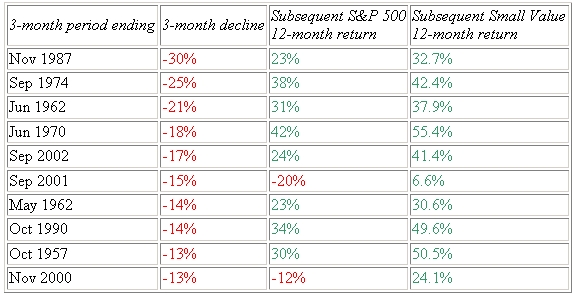In the three month period between Oct 19th, 2007 and Jan 18th, 2008, the S&P 500 (SPY) index fell 14.1% and the Russell 2000 Value Index (IWN) fell 19.5%. To understand what is likely to happen next, I studied the top 10 worst three-month-sell-offs since 1950. These sell-offs ranged between -13% to -30%. I found that in 8 out of the 10 occasions, the S&P 500 index rebounded by more than 20% in one year. Small Cap Value stocks did even better. The Fama & French Small Cap Value Index rallied more than 30% in one year in 8 out of the 10 occasions. In the other two occasions, it increased 6.6% and 24.1% respectively. (See Table below.)