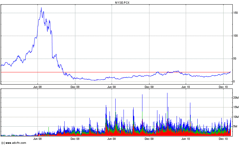 PCX: With 1 million met coal already sold at 140 per ton and 5 million more met tons still unhedged for 2011, more then likely will get 140-210 per ton; just 140 per ton would equal ~40 realized per ton or 6x 40 = 240 million /91 million shares = ~2.65ebtathis can easily be double considering every ten above 140 equals another ~1ebta and met coal 200+ per ton now - 2.50 times 20pe = ~50 per share. PCX realizes ~165 per ton on the 6 million ton 140/available = ~4 x 20 equals 80 per share; a couple million thermal contracts are expiring by the end of 2011 and CEO said they expect to realize 50 million or ~.75ebta from this...also a few more million expire in 2012 which CEO stated this would result in another 150 million realized that is ~2ebta from just these contracts expiring over the next two years let alone the above met coal. And in 2012 PCX has 8 million tons unhedged unlike the ~6 they had/have for 2011. Either way could realize 2-8ebda sometime in 2011/2012 times 20pe equals PCX at 40-160 per share.