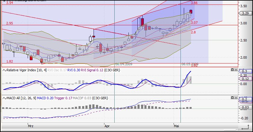 centrosolar macht sich hingegen recht gut und sollte jedenfalls die 3,88 erreichen. Weissaber nicht wie es über Freitag bies Dienstag wird könnte im allgemeinen erstmal zum Stillstand kommen. Ab nächste Woche Mittwoch gehts m.E. weiter nach oben. Dürfte aber auch für Evergreen gelten.