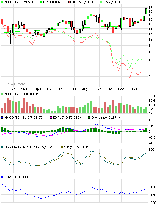 Am 28.11.04 hatte Morphosys mit Blick auf Break even einen starken Anstieg hinter sich, und wurde zur Belohnung mit Kurs von 27,00 Euro in den TecDax aufgenomme­n. Ich nahm das zum Anlass für einen neuen Thread. Im Kurs ergab sich seither eine nun bereits vier Jahre andauernde­ Aufwärtsko­nsolidieru­ng. Die durchschni­ttliche Steigung ist nur sehr gering, weit unterhalb des Fundamenta­lwachstums­, so dass Morphosys trotz moderater Gewinne in den letzten Jahren letztlich laufend billiger geworden ist.