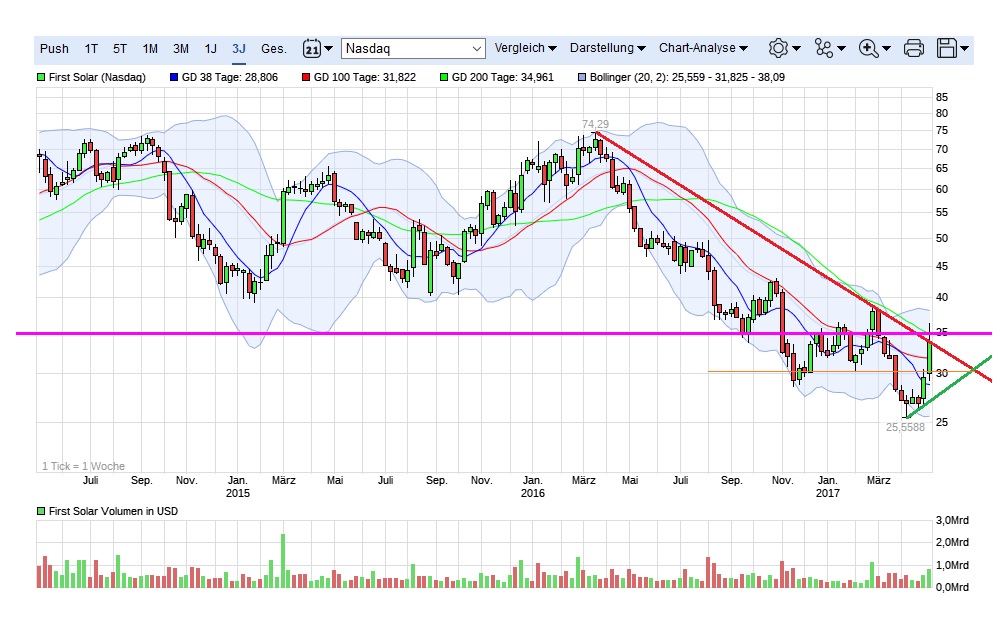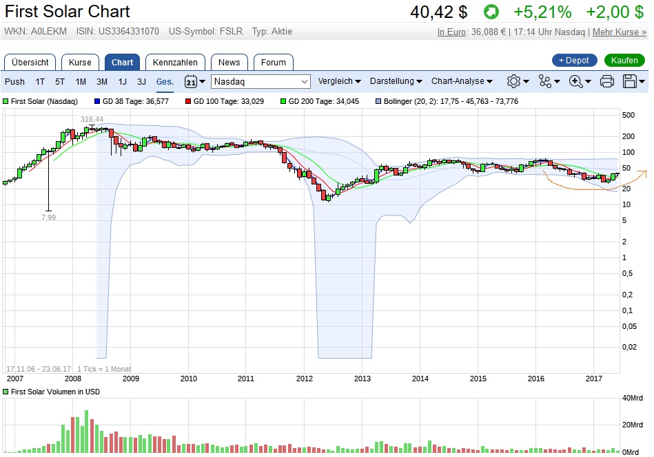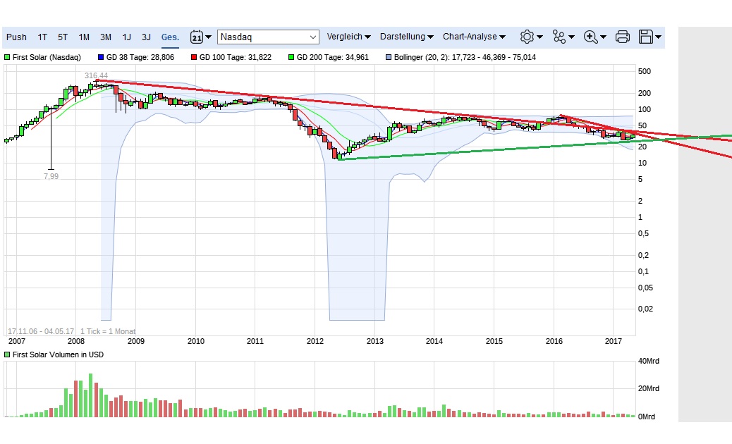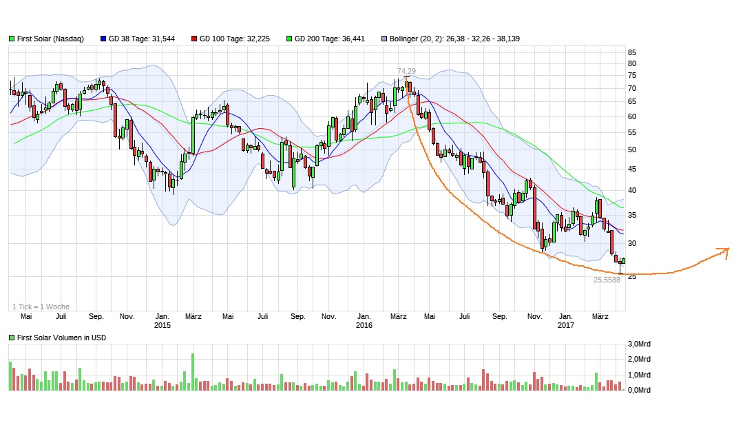 Zumindest sind die Daten und Zahlen gut Analysen sind positiv und aufgrund einige Vergleiche mit anderen Playern ist First Solar nach übereinstimmender Meinung am besten positioniert. Cash Aussichten Portfolio und Alleinstellungsmerkmal sind gute Aussichten für 50 % bis 12/2018