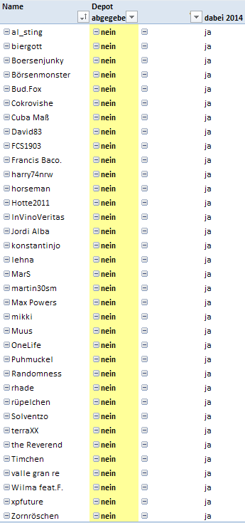 Änderungen zB des Yahoo Kürzels, die in 2013/14 ab und zu vorkamen, muss jeder Depotinhaber selbst verfolgen und dem Spielleiter melden. Gleiches gilt für Splitts und KEs sowie für Dividenden, falls diese geführt werden sollten.