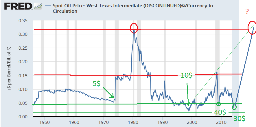 Meine Zukunftsprognose wir werden das Verhältnis von 1980 wiedersehen bevor es langfristig bergabgeht. 5$ Dollar/ Barrel are no option on the table, haha;-)