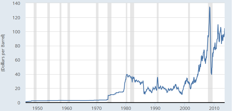 Bei (niedrig angenommer) Inflationsrate von 2% wäre Öl (1080 bei 33$) heute nicht 90$ wert, sondern ziemlich genau 66$. Ist leicht nachzurechnen...