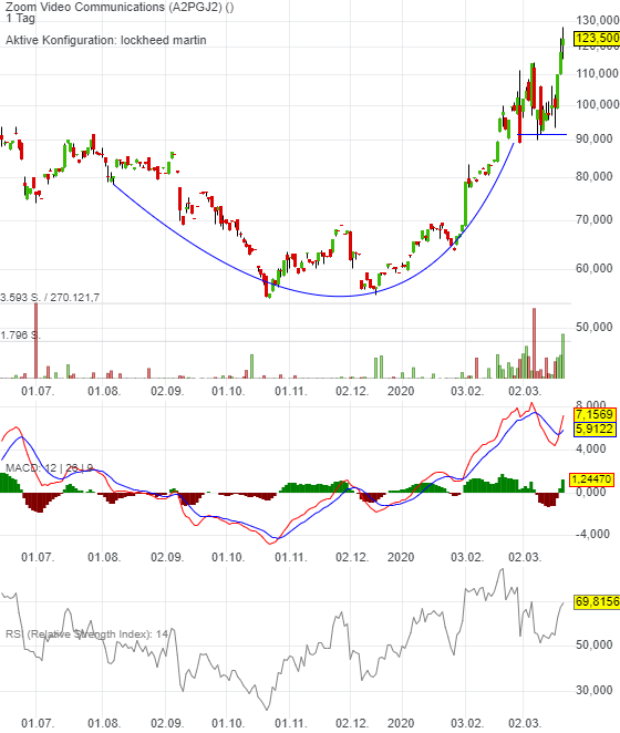 vor ein paar Tagen bei 108 EUR eingestiegen. Die jetzigen Corona-Ausgangs/Kontaktbeschränkungen werden dem Unternehmen nützen, denke ich. Ich denke außerdem, dass die Coronakrise das Verhalten der Menschen dauerhaft beeinflussen wird, so dass die Videokonferenzen auch nach der Krise zur Normalität werden. In diesem Sinne, hat das Unternehmen gute Aussichten auf ein langfristiges Geschäft