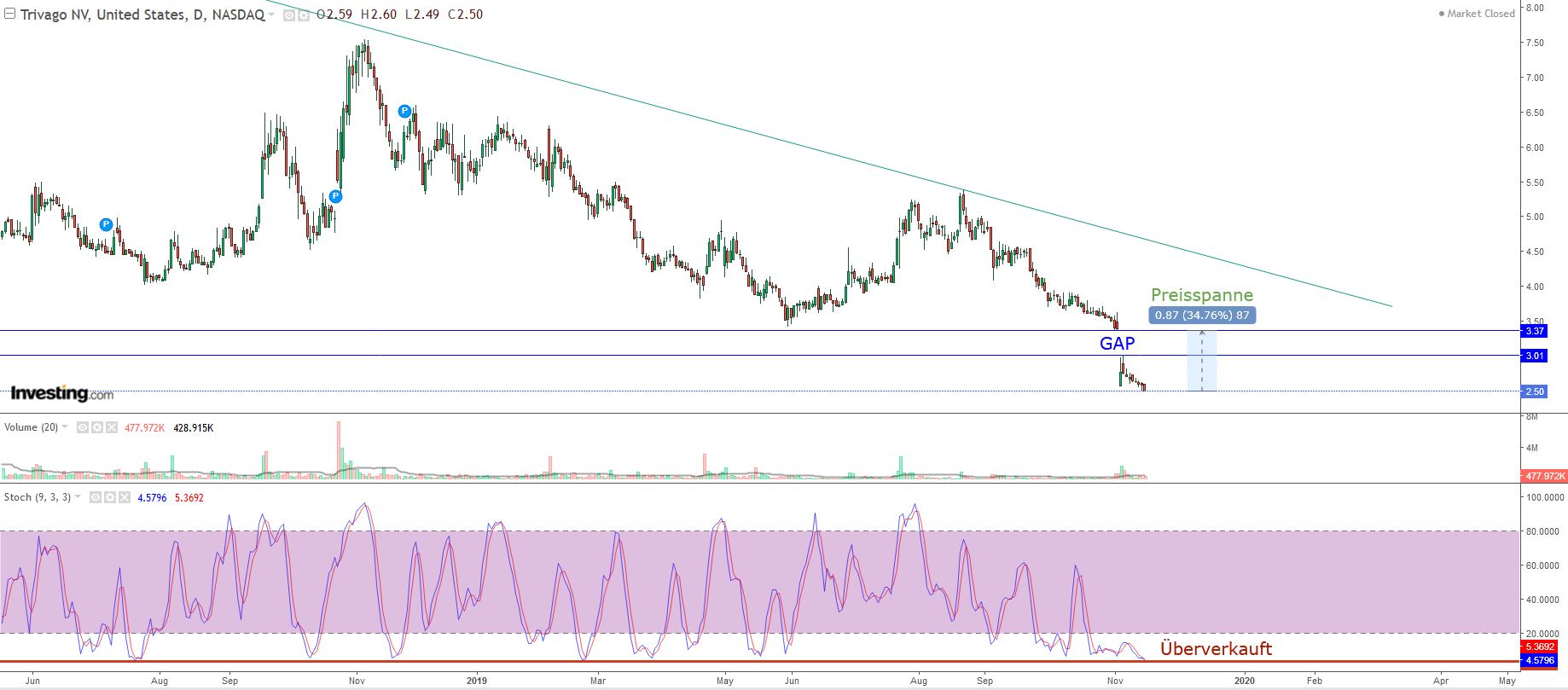 Trivago ging im Dezember 2016 an die Börse. In den ersten sechs Monaten konnte sich der Aktienwert von elf auf 24 Dollar mehr als verdoppeln. Dann folgte der Absturz: Nach einer Gewinnwarnung im Jahr 2017 sank der Kurs auf sechs US-Dollar. Momentan liegt er bei 4,68 US-Dollar (Stand: 24. Juli 2019, 14 Uhr).