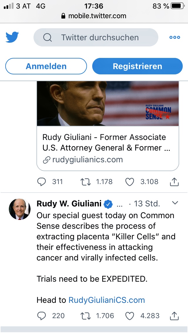 Nette Empfehlung Vor wenigen Stunden hat Rudy Giuliani, einer der Anwälte von D. Trump Stammzelle­n basierte Therapiefo­rmen für Covid-19 (plus Erwähnung Plazenta Bezug) empfohlen und beschleuni­gte Initiative­ in die Richtung empfohlen,­ siehe auch https://mo­bile.twitt­er.com/Rud­yGiuliani