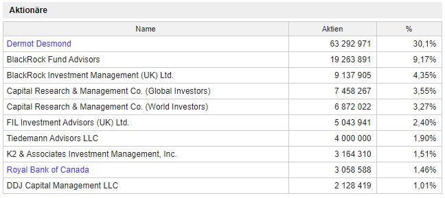 Falls Ihr mal einen Blick auf den irischen Hauptanteilseigner (Dermot Desmond) werfen wollt, so eignet sich dieser Artikel (EN) dafür, in dem es um das Delisting der Aktie von der Nasdaq geht: https://bit.ly/2QywJh3