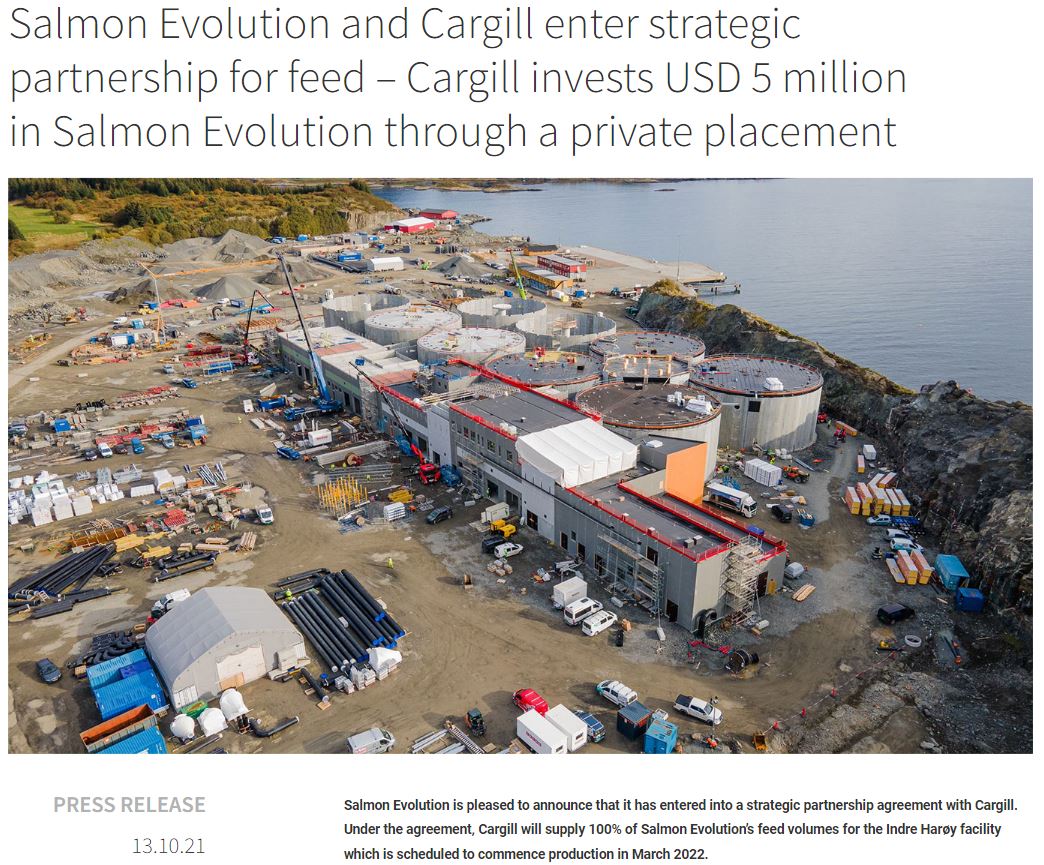 Salmon Evolution und Cargill gehen strategische Partnerschaft für Futtermittel ein Cargill investiert 5 Millionen USD in Salmon Evolution durch eine Privatplatzierung