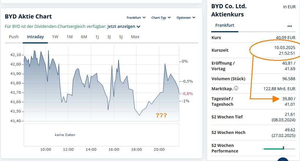 (Meine Prognose: Es wird binnen 12 Monaten ab 26.02.25 14:30 wieder "unter 40,-" bei BYD dranstehen, an irgendeinem Tag, Börsenplatz Frankfurt. Wir können um ein Glas kühles Wasser oder einen Milchkaffee wetten. Den Wetteinsatz finde ich für alle hier tragbar! Über den Ort der Einlösung müssen wir ggf. noch reden.)
