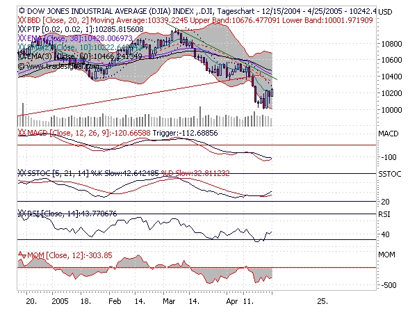 Sieht schon bearish aus, allerdings zeigt mein "Stamm-Chart" (DOW-daily in Verbindung mit MACD und Stochastik) eher ein Aufwärtspotential. Ist derzeit schwer, den richtigen Einstieg zu finden. Für mich als swingtrader bedeutet das, dass ich nicht unbedingt investiert sein muß. Aber mal abwarten, was heute noch so alles passiert ;-)