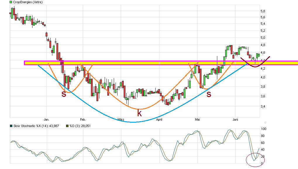 Mit der laufenden Korrektur wäre man wieder dort angekommen wo in der zweiten Septemberhälfte des letzten Jahres mit einem Gap nach oben ausbrach. Da der Ethanolpreis die letzten Monate wieder zurückgekommen ist, geht natürlich auch die im letzten Herbst aufgekeimte Kursphantasie wieder raus. Zudem ist der Ethalolpreis zu niedrig, um die in Englland eingemottete Ethanolfabrik wieder zu reaktivieren. Von daher muß man jetzt einfach weiter beobachten wie der Ethalolpreis sich entwickelt und ob man mal klare Anzeichen erkennen kann, daß ein Boden dort gefunden sein könnte
