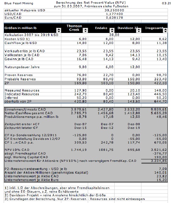 Hier deuten - zumindest derzeit - alle Anzeichen eher auf steigende als auf fallende Preise hin. Bei einem Molypreis von 30 USD ist die Kalkulation mit 20 USD ausgesprochen konservativ. Was auch für alle anderen Parameter gilt. Allerdings, und das wäre auch zu prüfen, verkauft BPM sein Moly nicht für durchschnitlich 30 USD, sondern deutlich darunter.