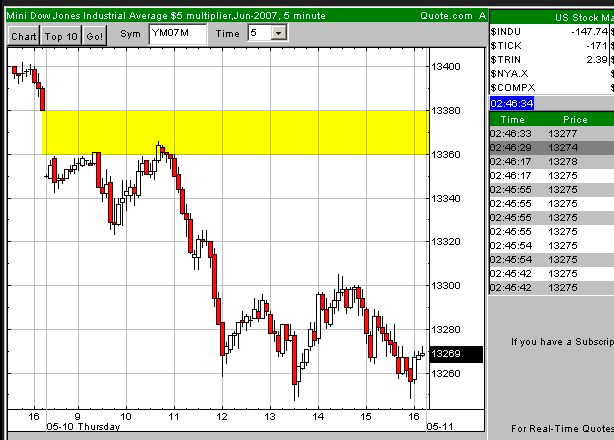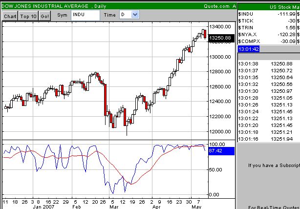 Letzte Woche Freitag gab es ungewöhlich hohe Umsätze bei fallenden US-Märkten. Desweiteren sieht man im Chart ein Doppeltop. Wenn man von einer 50% Korrektur des Anstieges seit der Korrektur Ende Februar ausgeht so müsste der DOW bis ca. 12800 fallen.