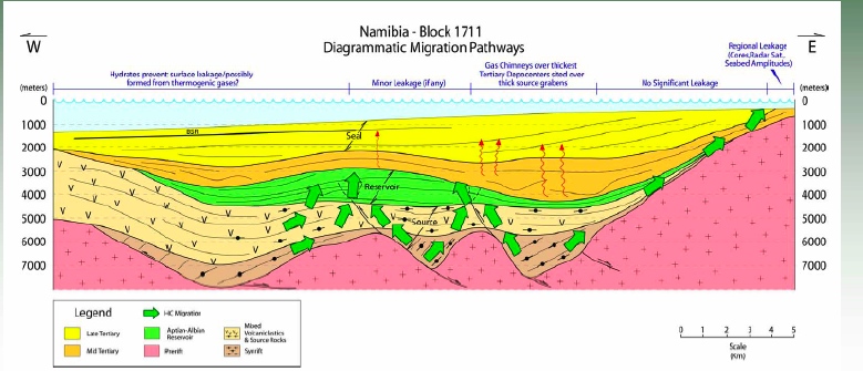 Der EnerGulf-Train hat, wie bereits an anderer Stelle geschrieben, Fahrt aufgenommen. Nachdem die Projektplanung weitgehend abgeschlossen ist, EnerGulf seinen Finanzierungsanteil am Projekt eingebracht hat, stehen erste Bohrungen in Kunene an. Aufgrund der dort vorgefundenen Primärindikatoren, z.B. Gassschlote am Meeresgrund, für das Vorhandensein von Öl oder Gas, ist Jeff Greenblum bekanntlich sehr zuversichtlich, dort fündig werden. In Kunene werden die Bohrungen zudem durch die wannenartige Struktur des Prospekts begünstigt. Schon seit längerem weiß man sehr genau wo und wie tief man die erste Bohrung ansetzen muss.