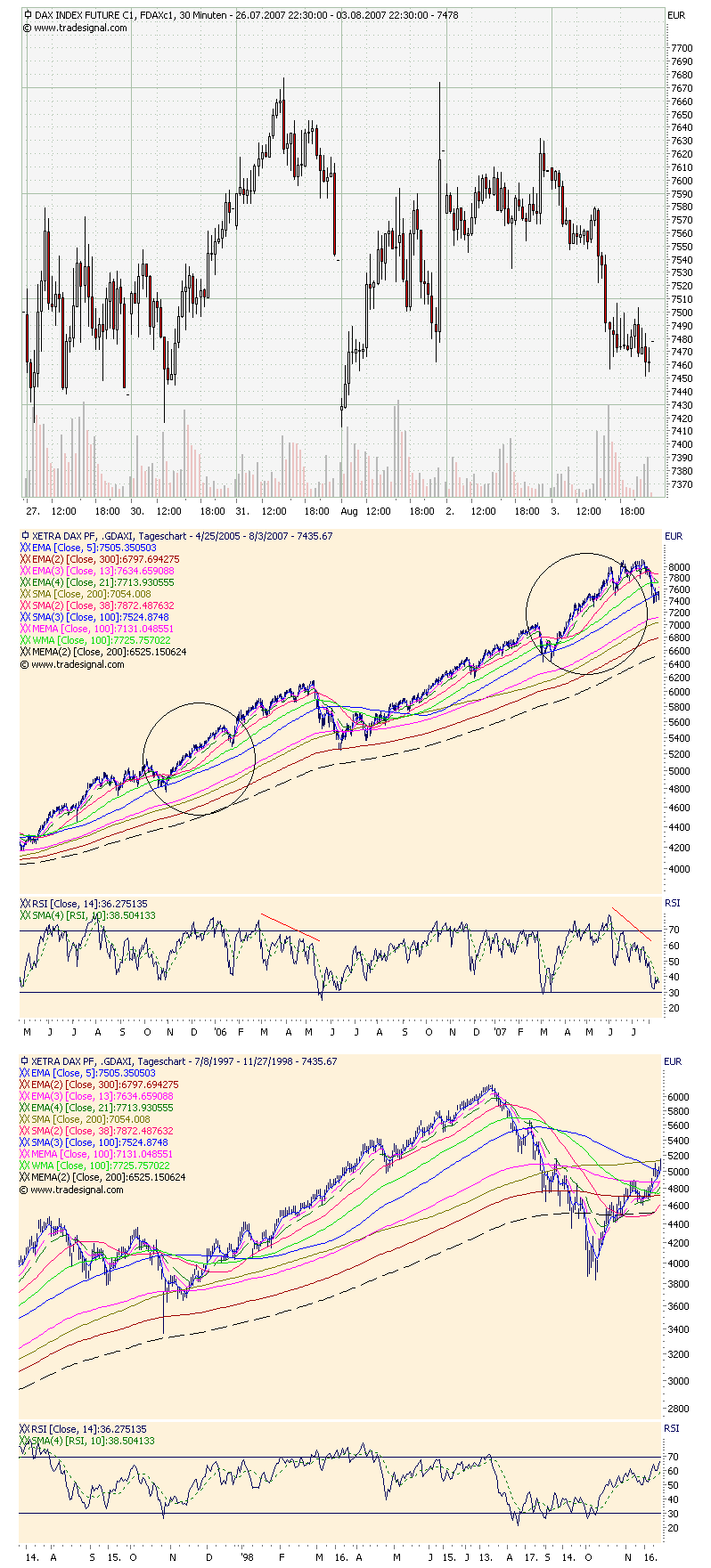 Nun liegen wir schon unter der blauen SMA100 und zwischen SMA100 und roten MEMA100 ist eine UP-Korrektur nicht unwahrscheinlich, dazu noch der 1998 Vergleich welcher ja etwa zum selben Zeitpunkt begann und jetzt in aller Munde ist auch da gabs eine UP-Korrektur ähnlich wie auch 2006.
