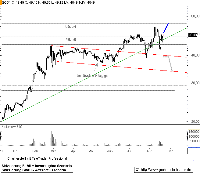 Kurz-Kommentierung: Innerhalb ihrer langfristigen Aufwärtsbewegung durchbrach die SOLON Aktie Mitte Juni 2007 bei ca. 41,77 Eúro aus ihrer bullischen Flagge aus. Das bullische Kursgeschehen brachte den Wert vorerst auf einen Höchststand von 55,64 Euro. Es folgte eine scharfe Korrektur bis 42,54 Euro. Mit einer aktuellen Notierung von 49,49 Euro ist die Aktie jedoch schon wieder oberhalb aller Trendlinien, welche sie davor unterschritten hat. SOLON sollte direkt von jetzigem Kursniveau ausgehend ansteigen mit einem Tradingziel bei 55,64 Euro. Alternativ testet die Aktie bei einem Rückfall unter 39,69 Euro und somit in die bullische Flagge die Unterkante der Flagge. Das Kursziel dieser Bewegung wäre dann ca. 33,84 Euro