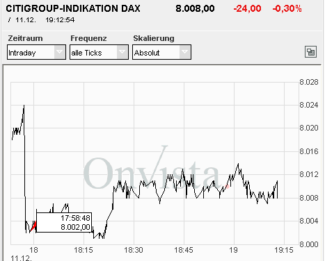 06.12. Es sollten steigende Kurse bis 8001 entstehen. Das Hoch wurde bei 7998 gehandelt. Anschließend fallende Kurse in den Bereich 7866 führen. Das Tief wurde bei 7912 gehandelt. 10.12. Das Hoch bei 8009 sollte überschritten werden. Das Hoch wurde bei 8057 gehandelt.
