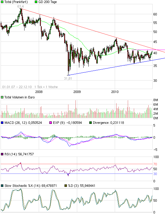 der tiefste kurs die letzten 3 jahre (also inkl. Krise) war um die 32 bis 33 euro und zu der zeit war der ölpreis um die 40 dollar , und chart hin oder her nachdem Total nächstes jahr die dividenden weiter erhöhen will und vierteljährlich auszahlen wird bleibt das ein interessantes langzeitinvest :)