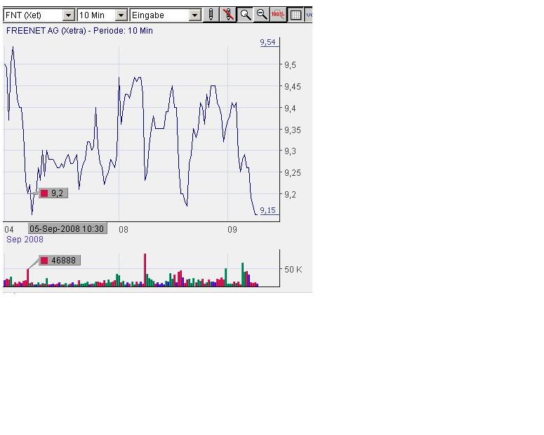 05.09.2008 - Die Aktie von Freenet hat sich in den vergangenen Tagen erneut erfolglos an einem Ausbruch über den Widerstandsbereich unterhalb von 10,15 Euro versucht. Der Anstieg nach hartem Test einer Unterstützungszone, die nun zwischen 9,34 Euro und 9,45 Euro liegt, hatte zuvor für einen Anstieg zurück an den Widerstand gesorgt. Fast logisch allerdings, dass das Freenet-Papier nach dem erfolglosen Ausbruchsversuch wieder in Richtung der genannten Unterstützungszone zurück gefallen ist. Am Donnerstag wurden das Tief bei 9,44 Euro und der Schlusskurs bei 9,49 Euro verzeichnet.