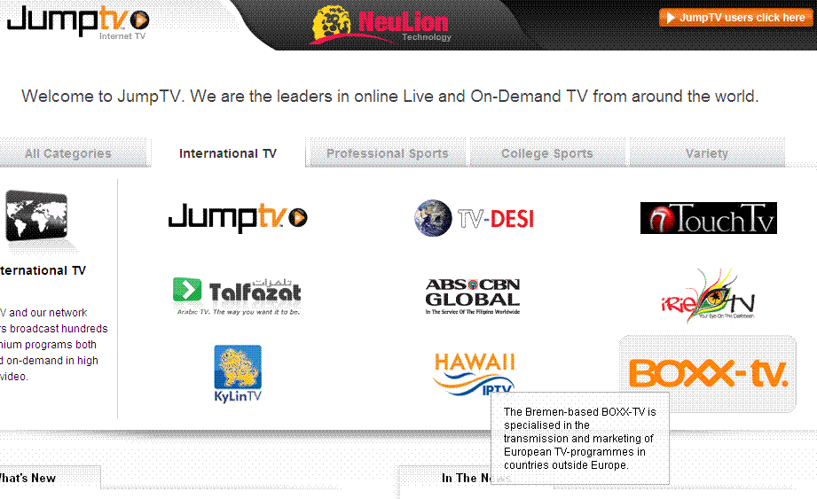 Hier finden Sie unser Logo. Gehen Sie auf www.neulion.com und dort oben auf den Button JumpTV klicken. Wenn Sie dort auf den Button „International TV“ kicken, werden Sie alle internationalen Pakete finden, auch BOXX-TV. Und bevor Sie auf BOXX klicken, schauen Sie, was der Mauszeiger anzeigt, wenn Sie auf das Logo von BOXX gehen.