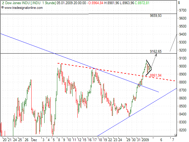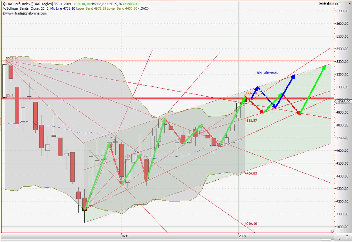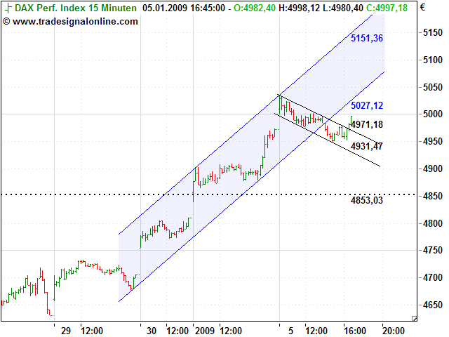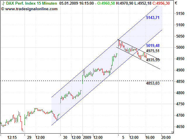 wird die flagge bullisch aufgelöst, sollte der dax über 4975 steigen und an den trendkanal (blau) heranlaufen.