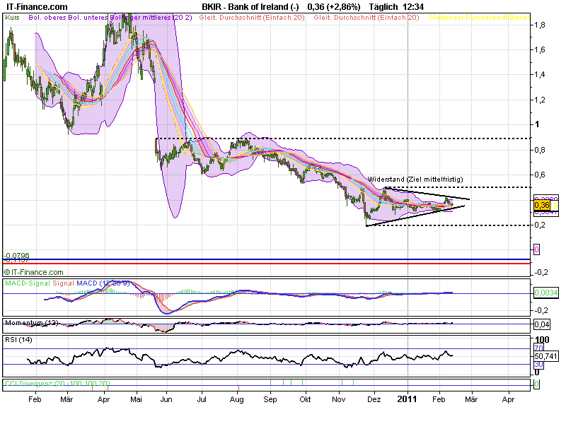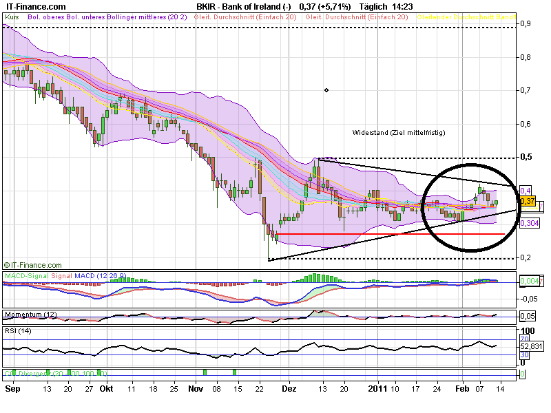 Wie Sie sicherlich wissen ist die Bank of Ireland die zweitgrößte Geschäftsbank Irlands mit der längsten Historie seit ihrer Gründung im Jahr 1719. Während der Finanzkrise war das Institut deutlich stabiler als die restlichen Banken des Landes. So verwundert meine Überlegung nicht, dass die BoI der Krisengewinner in Irland sein könnte. Während andere Banken stark geschwächt und überwiegend bzw. vollständig verstaatlicht wurden bemüht sich die Regierung Irlands bei der BoI um Lösungen die einer langfristigen Stabilisierung der Bank dienen sollen. Wie bekannt ist benötigt die BoI bis zum 28. Februar 2011 weiteres Eigenkapital in Höhe von 1,4 Milliarden Euro. Es ist für das Institut derzeit jedoch sehr schwer private Investoren zu finden, da im März 2011 die Ergebnisse eines weiteren Stresstests bekannt gegeben werden sollen. Derzeit gibt es Gerüchte über Verhandlungen der Regierung mit der Bank über eine Zwischenfinanzierung. So soll es gelingen die Zeit für die Kapitalsuche bis nach der Veröffentlichung der Stresstest-Ergebnisse zu verlängern ohne den Anteil der Regierung an der BoI erhöhen zu müssen. Eine mögliche Lösung um den Eigenkapitalanforderungen in der Zwischenzeit gerecht zu werden wäre die Ausgabe von Vorzugsaktien. Sollte dies eintreffen ist es ein sehr positives Signal dass die Regierung Irlands die BoI zur zukünftig stärksten Bank des Landes machen wird.
