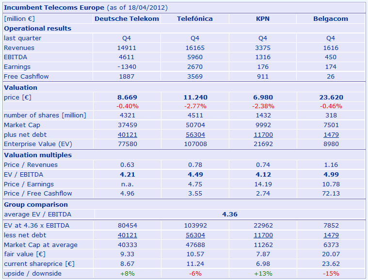 Die lt. Presseberichten vom Wochenanfang evtl. zum Verkauf stehende belgische Tochter (kolportiert wurde ein Verkaufspreis im Bereich von 1,8 Mrd) setzte 2011 785 Mio EUR um (zum Vergleich E-Plus: 3,241) mit einem EBITDA von 0,271 Mrd (E-Plus: 1,374; KPN gesamt: 5,3 Mrd). Da der Verkauf die Nettofinanzverschuldung in einen Bereich von 10 Mrd drücken würde (also um ca. 15 %), das EBITDA aber nur um etwa 6 % fallen würde (grob geschätzt, da man die interne Planung für 2012 ff. nicht kennt), sähe ich einen Verkauf positiv, auch wenn es sich schon um Teile des Tafelsilbers handelt.