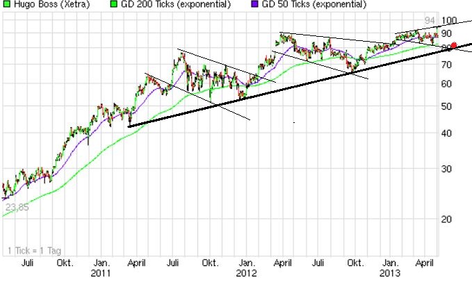 Die Aktie von Hugo Boss erreichte am 13. März 2013 ein Hoch bei 92,36 Euro. Dieses Hoch stellt das aktuelle Allzeithoch dar. Seit diesem Hoch konsolidiert die Aktie. Dabei fiel die Aktie auf die Unterstützung bei 82,86 Euro zurück. Aktuell nähert sich der Wert erneut dieser Unterstützung an. An dieser Stelle könnte der Wert wieder nach oben abdrehen. Anschließend ist eine weitere Rally in Richtung 92,36 Euro starten.