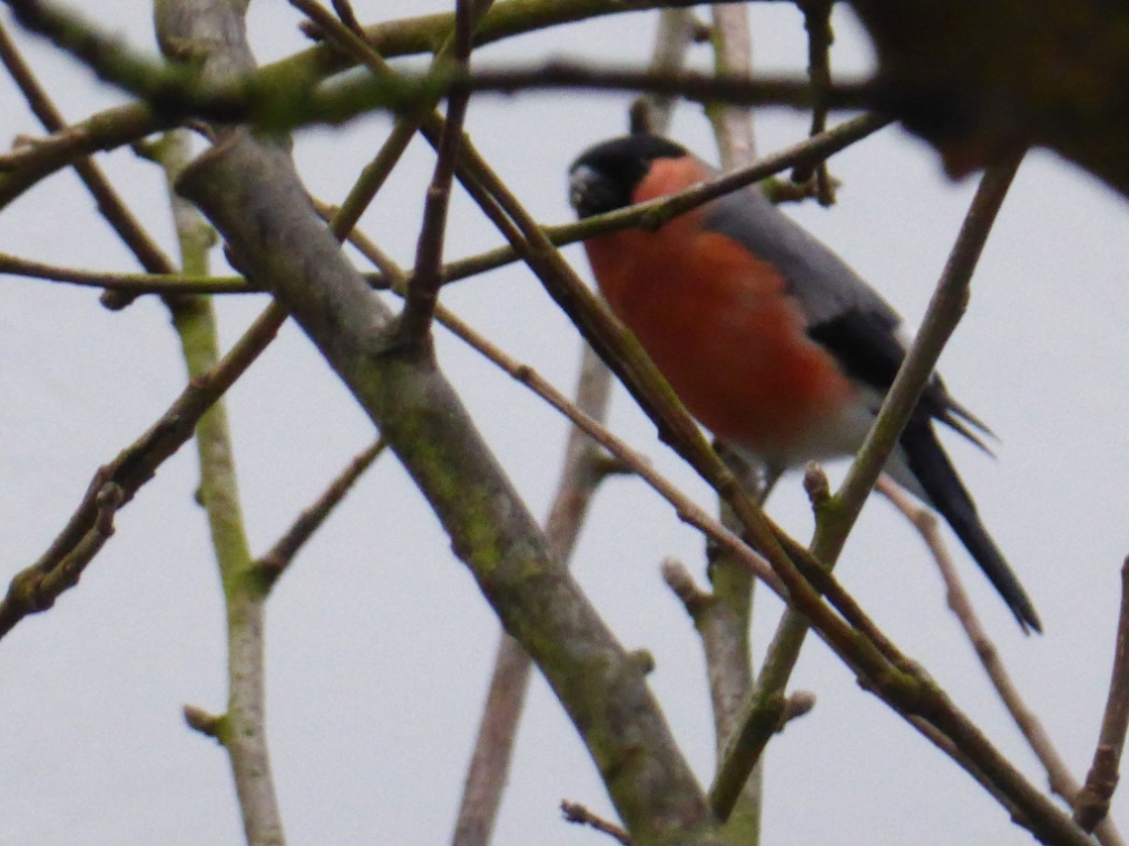 Das Gimpel oder Dompfaffpärchen schaut jeden Morgen vorbei und holt sich eine große Portion Vogelfutter ab. Er hat sich natürlich versteckt hinter den Zweigen.