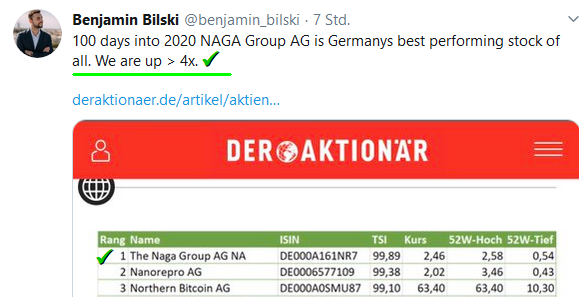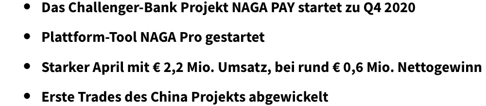 langsam eine Entwicklung statt. Naga Pay und das China Geschäft mit dem Aktienhandel klingt vielversprechend. Durch Corona und im Herbst noch die Trump Wahl bleiben die Handelsaktivitäten sicherlich noch hoch.