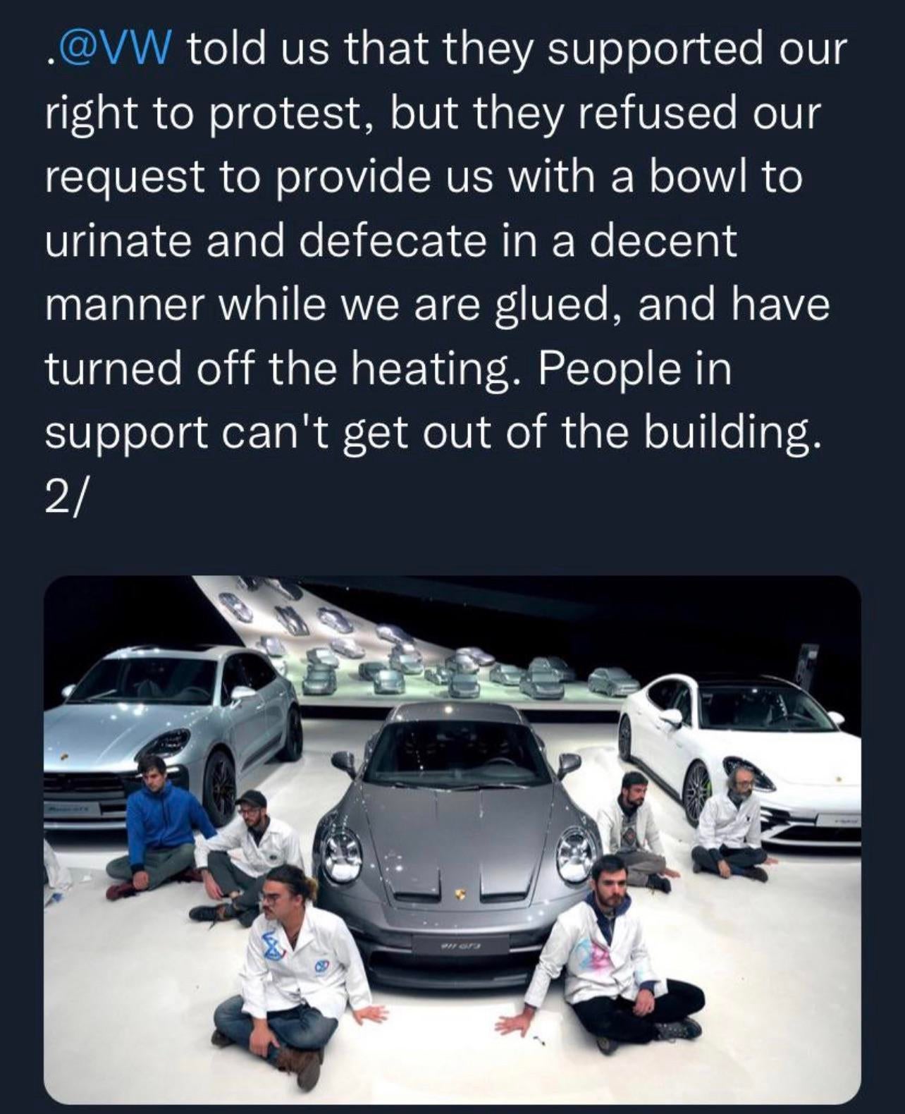 Sie klebten sich vor mehrere ausgestell­te Fahrzeuge auf den Boden und forderten unter anderem ein Tempolimit­ von 100 km/h auf deutschen Autobahnen­, einen weltweiten­ Baustopp für Autofabrik­en und die Entschuldu­ng der südlichen Erdhalbkug­el. Dinge, die VW als Unternehme­n aber nicht umsetzen kann.