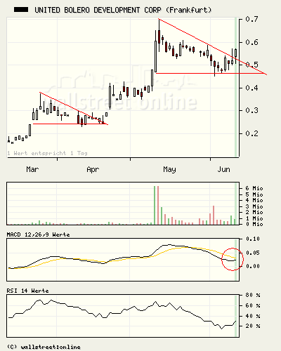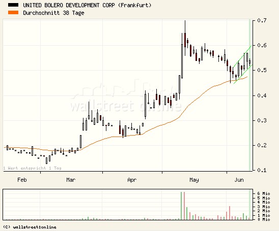 Die Aktie United Bolero befindet sich nach der Korrektur die auf der 38-Tage-Linie geendet hat, wieder in einem schönen steilen Abwärtstrend. Nach unten hin sollten die 52 ct halten, im Worst Case die 45 ct. Zunächst müssten nach oben hin die 60 ct gebrochen werden, um in den nächsten Tagen in den Bereich 0,70 ct - 0,80 ct zu gelangen.