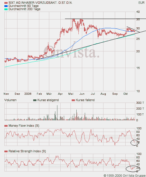 schon alles im Lot. Sixt konsolidiert halt immer etwas länger. Selbst 27,50 sind ok und würden den Aufwärtstrend nochmal bestätigen. Der Moneyflow ist fett im Minus und kann fast nur drehen, ebenso der RSI. Geduld is nun mal erforderlich. Dafür ist Sixt auch extrem risikoarm. Und am 16.11., also in knapp 3 Wochen, kommen neue Zahlen. Spätestens die sollten neuen Auftrieb geben bzw. die weitere Richtung vorgeben!