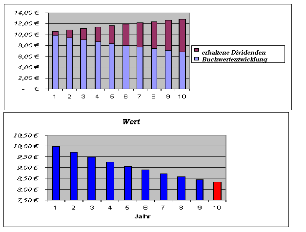 Ein Investor erhält nach 10 Jahre ~ 12€ am Aktionärsvermögen(Buchwert+Dividenden ausschüttung)