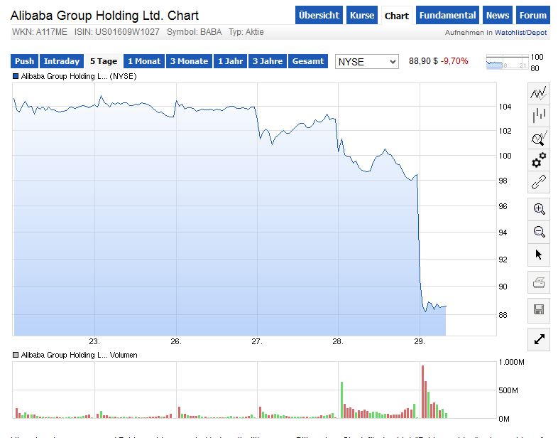 Vorbörslich stürzten Alibaba-Aktien um sieben Prozent ab."