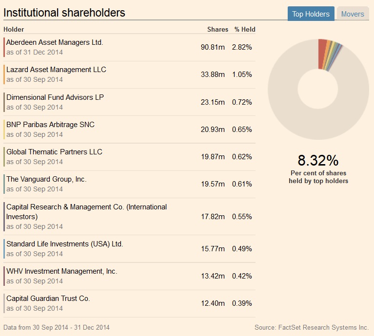 Zum 31.12.2014 halten die großen institutionellen Anleger insgesamt 8,32 Prozent der Aktien an dem Unternehmen.