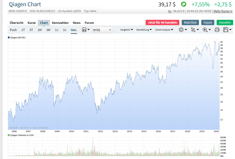 Qiagen 2020 Verstehe jetzt nicht ganz, warum der Kurs in Amerika 9% steigt und in Deutschlan­d nicht mal 2% ???