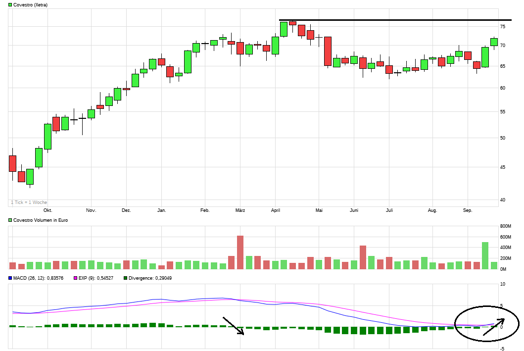 Der MACD signalisiert einen Trendwechsel ins positive nach einer langem längeren negativen Trend der sich im Kurs durch eine Seitwärtsbewegung dargestellt hat.