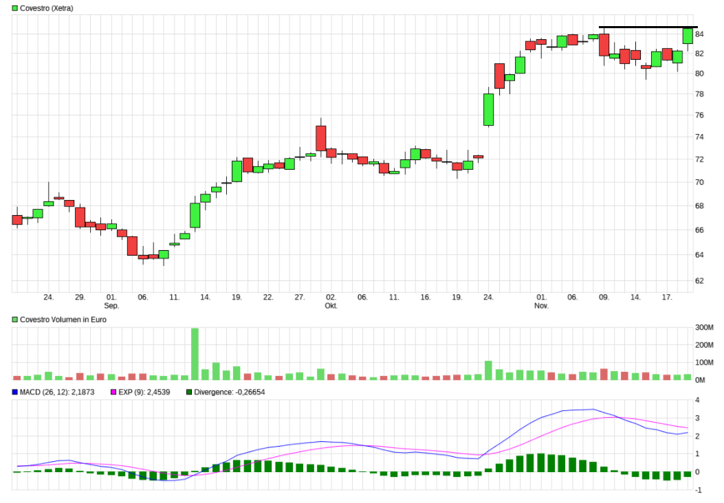 Obwohl die Papiere, gemessen am Schlusskurs vom Dienstag, mit 3,7 Prozent Abschlag veräußert wurden, legte der Kurs am Mittwoch in ähnlicher Größenordnung zu. Covestro wird als Kandidat für den Aufstieg in den DAX gehandelt.