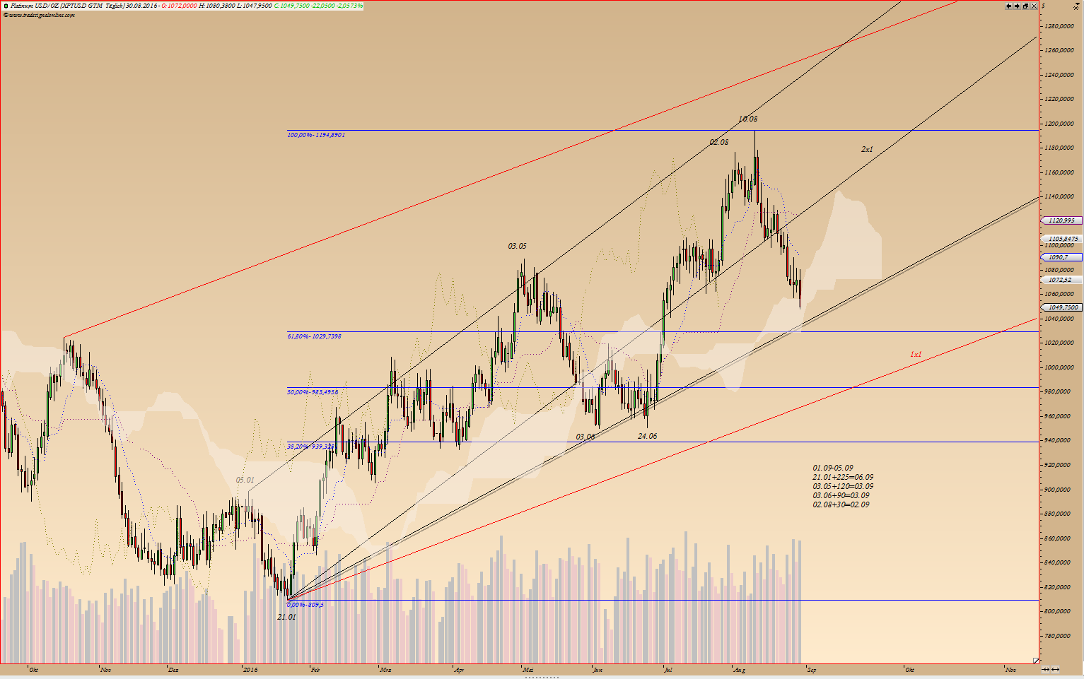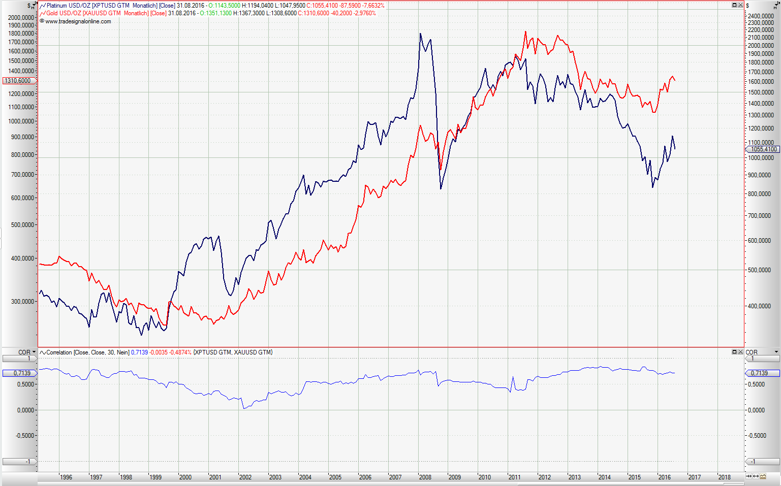 Die Aussage, dass beide Werte (Gold und Platin) parallel laufen, bzw. korrelieren, kann auch langfristiger (Monat) Chart bestätigen.