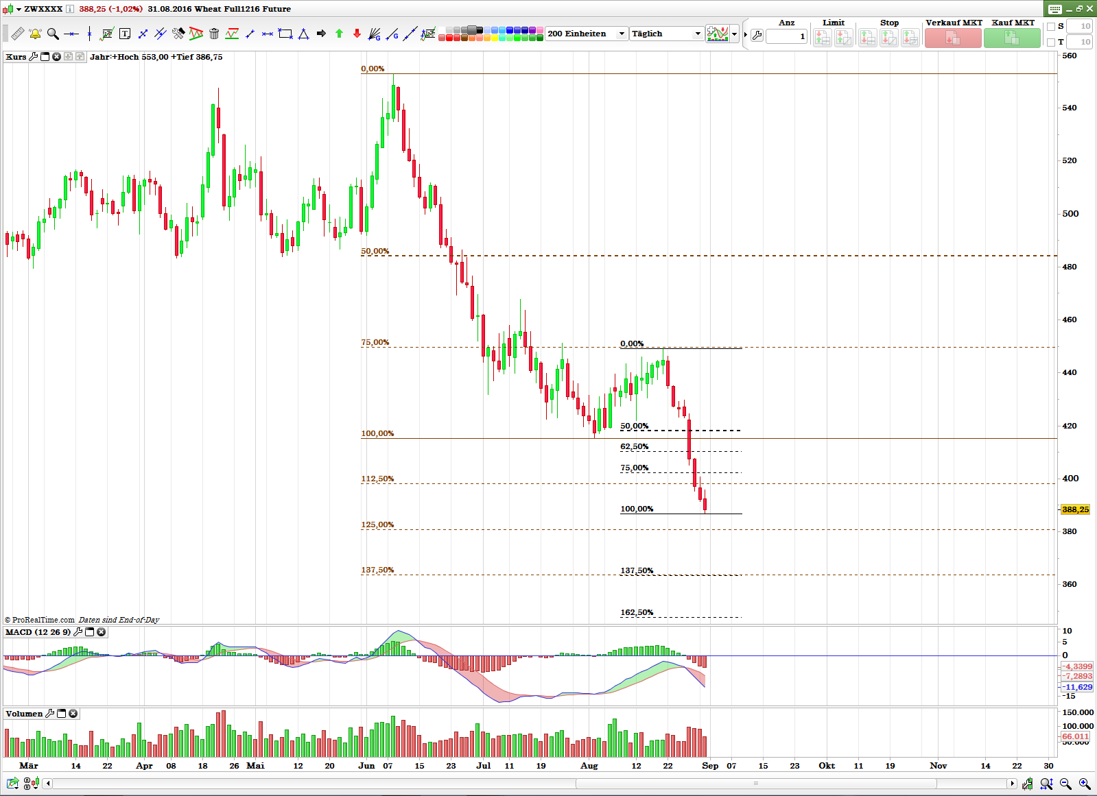 Unser Beispiel: Weizen. Ich gehe davon aus, dass Weizen bis zu bestimmten Marken weiter runter geht und weil Zyklus sein Tief im September macht und Weizen tatsächlich dem Verlauf, bis jetzt folgt, erhöhe ich die Warscheinlichkeit auf, sagen wir 60%. Wobei "Behavioral Finance" würde in diesem Fall von 50/50 sprechen :-)