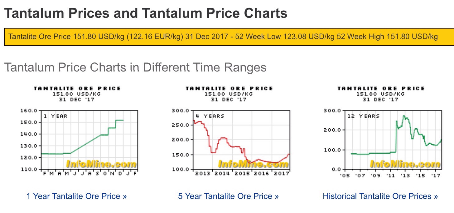 Infomine Tantalite Ore Price 151.80 USD/kg (122.16 EUR/kg) 31 Dec 2017 - 52 Week Low 123.08 USD/kg 52 Week High 151.80 USD/kg