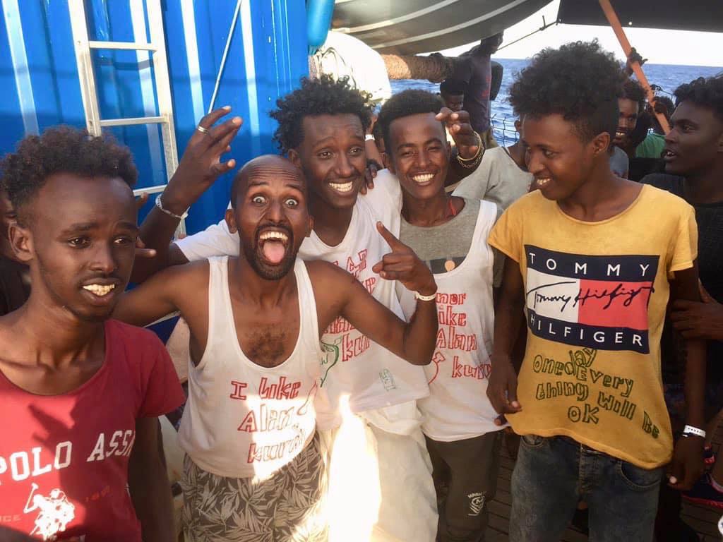 Die Flüchtlinge tragen ein T-Shirt und freuen sich ausgiebig über ihre Rettung.