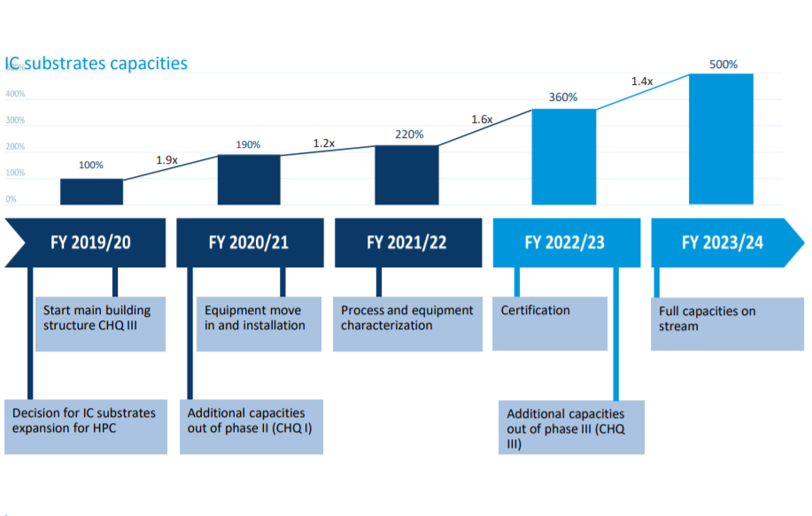 AT&S hat im Juni Quartal die neuen Produktionslinien für IC-Substrate gestartet. Dadurch wird bis Jahresende des aktuellen GJ 2020/21 die Produktionskapazität für IC-S um 90% J/J steigen, der entsprechende Umsatz um 50%.